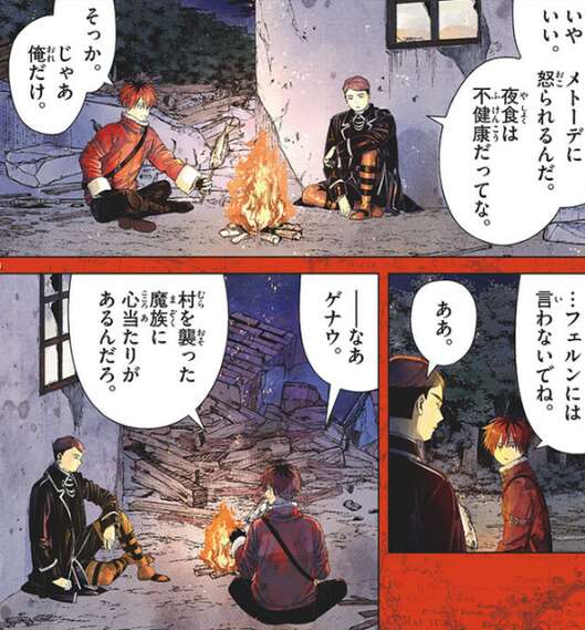 村に残ったシュタルクは夜、魚を釣ってきてゲナウに進めます。しかし、夜食は不健康だとメトーデに怒られる、とゲナウは言い魚は食べません。シュタルクは夜食を食べますが、フェルンには言わないでね、とゲナウにお願いし、ゲナウも言わないと約束します。シュタルクはゲナウに村を襲った魔族に心当たりがあるんだろう、と聞くと四刀流の魔族は神技のレヴォルテという名前で、ゲナウの相棒を殺した魔族だとシュタルクに答えます。神技のレヴォルテは魔法で作り上げた四本の剣を自在に操り、剣の重さも自在に変えられるそうです。
