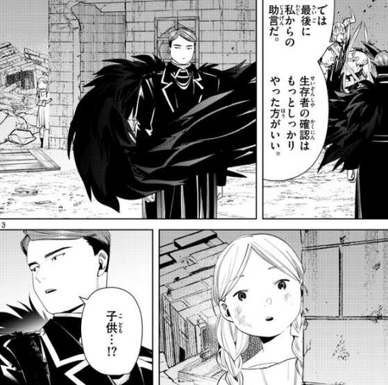 冒頭、夜食に関する会話がありますが、シュタルクがフェルンを怖がるのはともかく、ゲナウもメトーデを怖がっているのが意外です。やっぱり、メトーデも起こると怖いのでしょうか…。そして、レヴォルテが村を奇襲します。シュタルクの斧とゲナウの魔法、黒金の翼を操る魔法(デイガドナハト)でレヴォルテを追い詰めます。しかし、レヴォルテは部下の魔族を使い、レヴォルテ曰く、人の子供を庇う習性を利用して、ゲナウに逆襲します。レヴォルテが部下の魔族をあっさりと使い捨てる辺りは、魔族らしいといったところでしょうか。再びシュタルクも戦いに参加しレヴォルテに立ち向かいますが、この戦いがどんな結末になるか注目です。