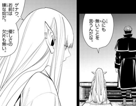 レヴォルテは剣をゲナウに振り下ろしますが、シュタルクはレヴォルテの剣を正面から受け、ゲナウを守ります。レヴォルテはシュタルクが自分の剣を正面から受け止めたことに驚きますが、ゲナウはシュタルクに死んだふりでもしていればいいものを、と自分を守らなくてもいいと言います。しかし、戦いは最後まで立っていた奴が勝つ、とシュタルクは答えます。それを聞きゲナウは、…お前いい奴だと思っていたが、ただの馬鹿だな、だがその考えは悪くない、と自分も死地に付き合うと言います。戦いは追い詰められるほど、生き残ったときの感動は大きいぞ、とゲナウが言うと、そりゃ楽しみだな、震えが止まらないぜ、とシュタルクもゲナウに答えレヴォルテに再び挑みます。