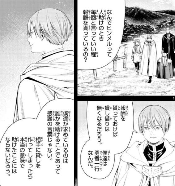 無事、竜の群れを討伐しフリーレンは村人から魔導書を受け取ります。村を出たフリーレン達ですが、フェルンはフリーレンが人助けをするときに、ほぼ毎回報酬を貰っている事を気にします。すると、ヒンメルがそうだったからね、とフリーレンが答えると、ヒンメルはそういうのは受け取らずに人助けをする人だと思っていました、とフェルンは意外そうに答えます。するとフリーレンはヒンメルとの思い出を話し始めます。フリーレンがある時、ヒンメルに人助けのとき毎回と言っていい程報酬を貰っている理由を聞きます。するとヒンメルは、報酬を貰っておけば貸し借りは無くなるから、とフリーレンに答えます。ヒンメルは、僕達が求めているのは誰かを助けることであって感謝の言葉じゃない、相手に貸しを作ってしまったら、本当の意味で助けたことにはならないだろう、と報酬を貰う理由をフリーレンに教えます。その時の事を思い出しながら、こんなくだらない魔法でも報酬として貰っておくんだよ、とフリーレンはシュタルクに報酬を貰う理由を教えます。しかし、その後嬉しそうにこの魔導書で本当に噛まないか実験しよう、と言っているフリーレンを見て、結局魔法が欲しいだけじゃないですか…、とフェルンに言われてしまいます。