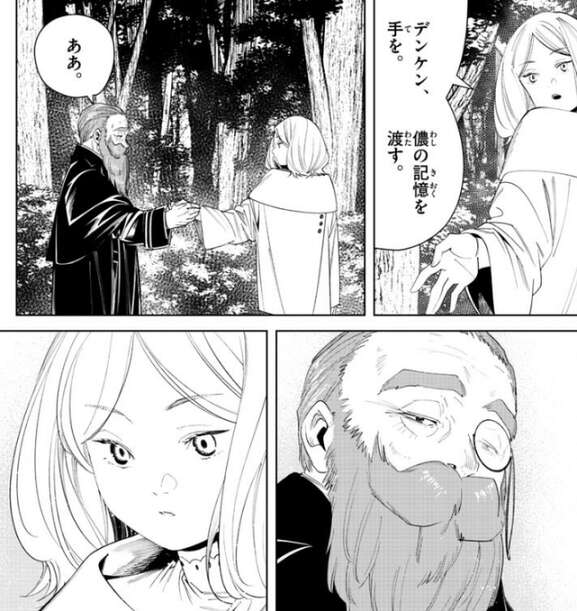 エーデルもデンケンに、墓参りは諦めろ、と念を押し、…わかっている、とデンケンは答えます。しかし、死ぬつもりじゃな、とエーデルはつぶやき、レルネンは自分がゼーリエの命には逆らえないからデンケンが少し羨ましいと言います。敵は最後にして最強の七崩賢、黄金郷のマハト、とレルネンは言うと、デンケンが黄金に変えられた故郷を救うために、黄金郷のマハトに立ち向かおうとしていると言います。