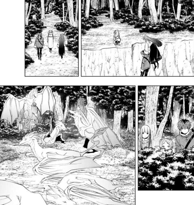 フェルンとシュタルクもフリーレンと一緒に行き、魔力の痕跡をたどりながら森の奥の方に進んでいきます。かなり森の奥まで進むと、フリーレン達は竜の群れを発見します。