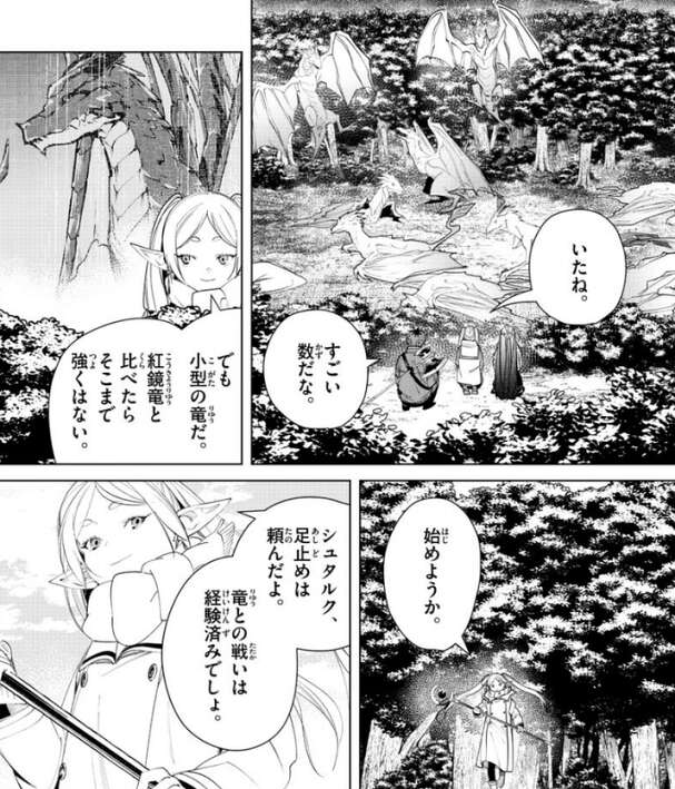 竜の数にビビるシュタルクですが、フリーレンは小型の竜で紅鏡竜に比べたらそこまで強くない、と冷静に竜の強さを分析します。シュタルクに始めようか、と言うとシュタルクに竜の足止めを頼みます。まったくスパルタだな、とシュタルクは簡単に竜の足止めを頼むフリーレンにあきれますが、シュタルクは竜に立ち向かうと必死で竜の足止めをします。