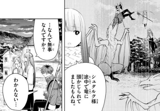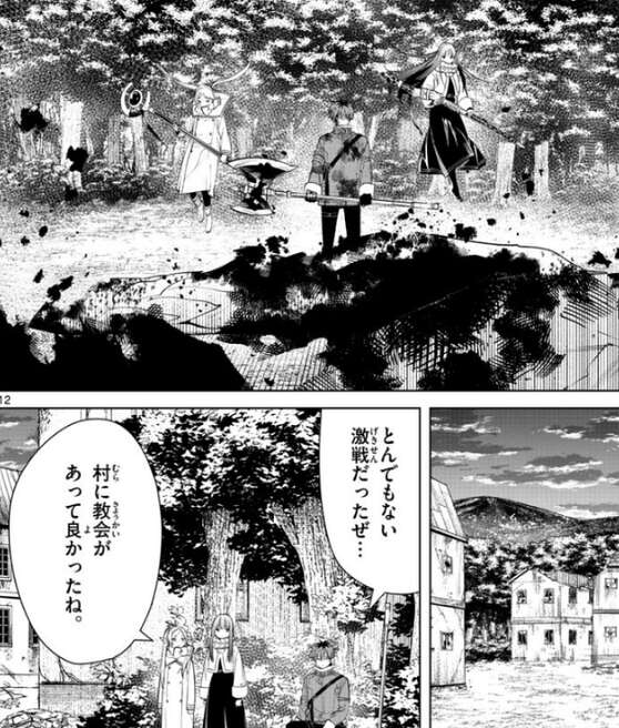 シュタルクは途中で竜に頭をかじられてしまったようですが、村に教会があったおかげで傷は治してもらったようです。竜に頭をかじられて死んでいないシュタルクに、なんで無事なんですか?と、フェルンは質問します。シュタルクも、わかんない…、と答えますが、まあ戦士なら普通なんじゃない、アイゼンも頭かじられて無傷だったし、とフリーレンはアイゼンの時の事を話しますが、それ絶対アイゼン様もおかしいですよ、とフェルンはツッコミます。