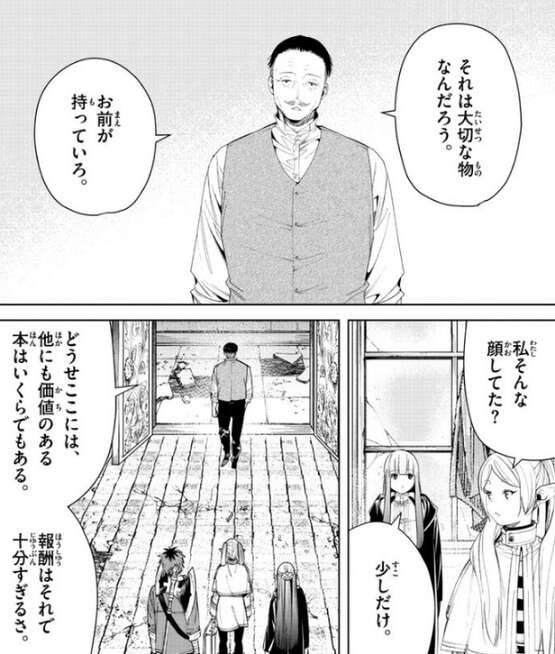 ヒンメルの伝記を懐かしそうに眺めた後、フリーレンは船頭の男性に依頼の報酬だと言い、伝記を渡そうとします。しかし、船頭はフリーレンが懐かしそうに伝記を眺めていた様子から、フリーレンが勇者一向にいたエルフの魔法使いだと気付きます。フリーレンが、どうしてそう思うの?と言うと、そんなに寂しそうな顔をしていたら嫌でもわかる、それは大切なものなんだろう、お前が持っていろ、と船頭は言い伝記はフリーレンが持っているように言います。他にも価値のある本はいくらでもある、報酬はそれで十分すぎるさ、と船頭は言うと、フリーレン達を湖の対岸まで送ります。
