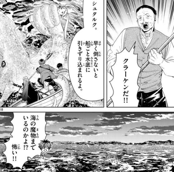 このまま何事もなくコリドーア湖を渡って対岸へ…、となるかと思いましたが、この湖にはクラーケンも出るようで、フリーレンがクラーケンに捕まって大変なことになっています。早く倒さないと船ごと水底に引きずり込まれるよ、とフリーレンは冷静にシュタルクに指示を出していますが、海の魔物までいるのかよ!?怖い!!と、シュタルクは怖がっています。