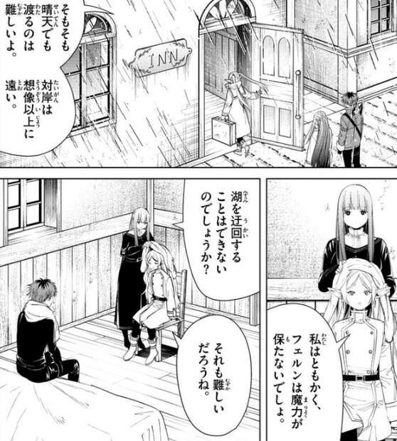 勇者ヒンメルの死から30年後、北部高原のコリドーア湖をフリーレン達は渡ろうとしています。しかし、この街に来てから一週間経ちますが天気は相変わらずの大荒れで、湖を渡る渡し船を出すことが出来ず足止めをくらっています。