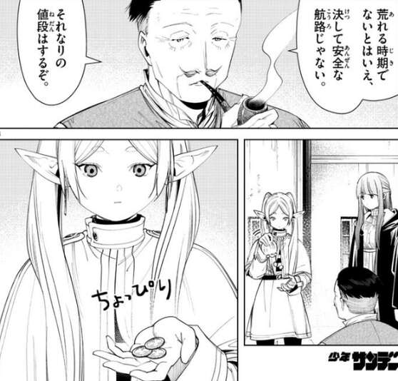 港町で待っている間、フリーレンが魔導書を買い過ぎたせいで今度は船代が足りなくなってしまいます。暇だったんだよ…、とフリーレンが言うと、渡し船を出す男性が、この先の島に打ち捨てられた修道院があるが、そこにある勇者ヒンメルが残したとされる伝記を見つけたら、船代と交換でいいと言います。