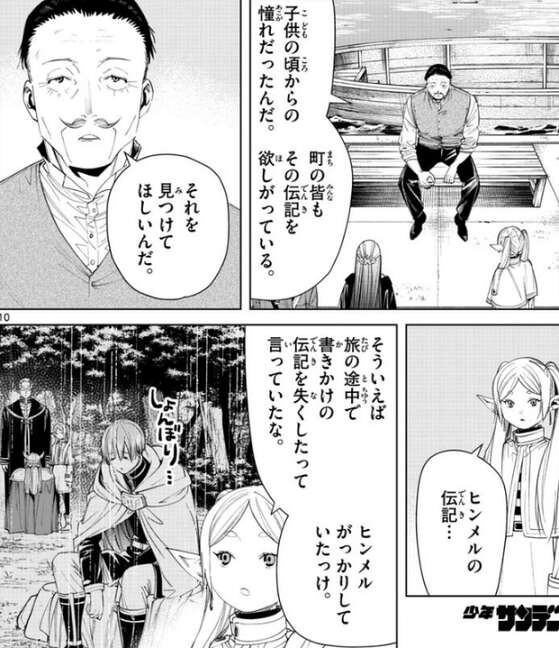 その話を聞いたフリーレンは、ヒンメルが旅の途中で書きかけの伝記を失くしてがっかりしていたことを思い出します。まさかあんな場所にあったなんて、とフリーレンは言うと交換条件に出された依頼を引き受けます。