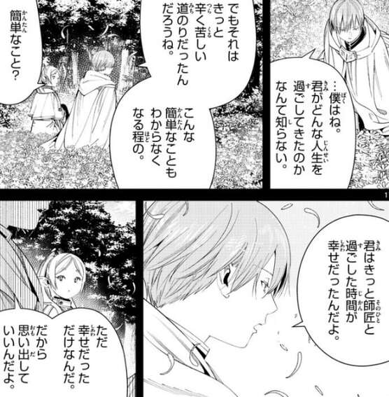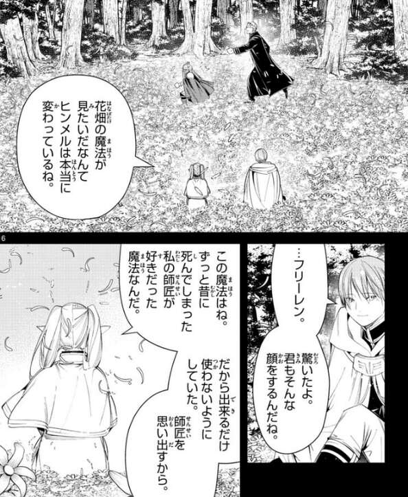 フリーレンは死んだ師匠のフランメの事を思い出してしまうので、出来るだけ使わないようにしていた、でも今はとても穏やかな気持ちなんだ、とヒンメルに言います。するとその言葉を聞き、君はきっと師匠と過ごした時間が幸せだったんだよ、ただ、幸せだっただけなんだ、だから思い出していいんだよ、思い出していいんだ、フリーレン、とヒンメルは笑顔でフリーレンに答えます。
