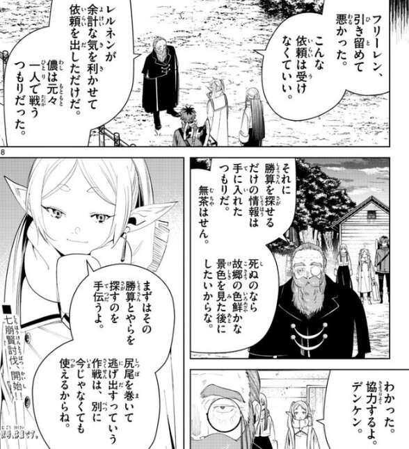 デンケンはフリーレンに、こんな依頼は受けなくていい、儂は元々一人で戦うつもりだった、と言います。さらに勝算を探せるだけの情報は手に入れたつもりだ、とデンケンがフリーレン達に言うと、ヒンメルとの思い出がよみがえったフリーレンは考えを変えます。まずはその勝算とやらを探すのを手伝うよ、尻尾を巻いて逃げ出すっていう作戦は、別に今じゃなくても使えるからね、とフリーレンは言いマハトから逃げずにデンケンに協力する事を選びます。