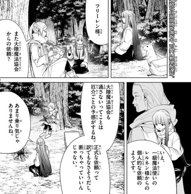 勇者ヒンメルの死から30年後、北部高原のヴァイゼ地方で野営をしていると、一級魔法使いのレルネンから依頼の郵便が届きます。フリーレンは、大陸魔法協会も通さないってことは厄介ごとの予感がする、正式な依頼って訳でもなさそうだし、と断ろうとします。ただ報酬の魔導書が一緒に送られてきている、とフェルンから聞くとフリーレンはすぐにやる気を出します。