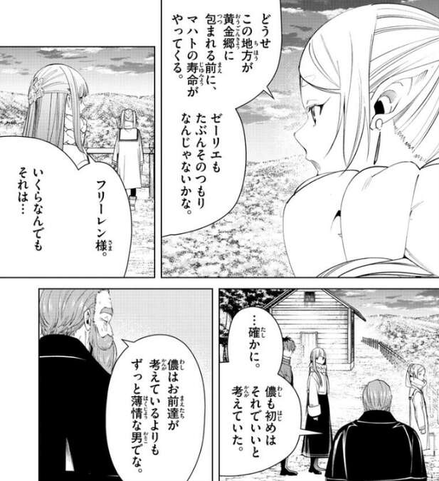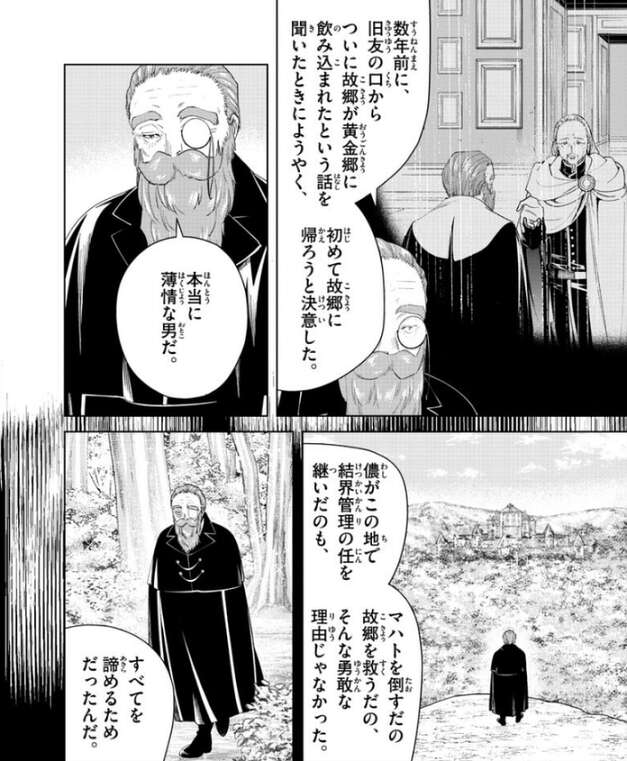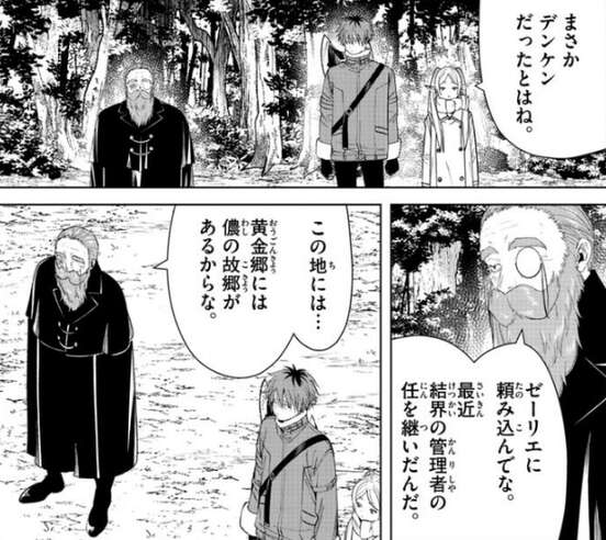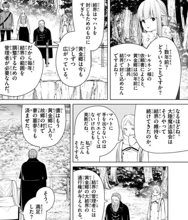さらに結界はマハトを封じるもので、黄金郷は今も少しずつ広がっていてデンケンの故郷は数年前に黄金郷に飲み込まれた、とデンケンはフリーレン達に言います。結界の管理者はマハトを封じる結界の範囲を調整するための管理者で、大陸魔法協会はそうやって結界を維持して、マハトにはこのまま手を出さないようだとフリーレンは推測します。