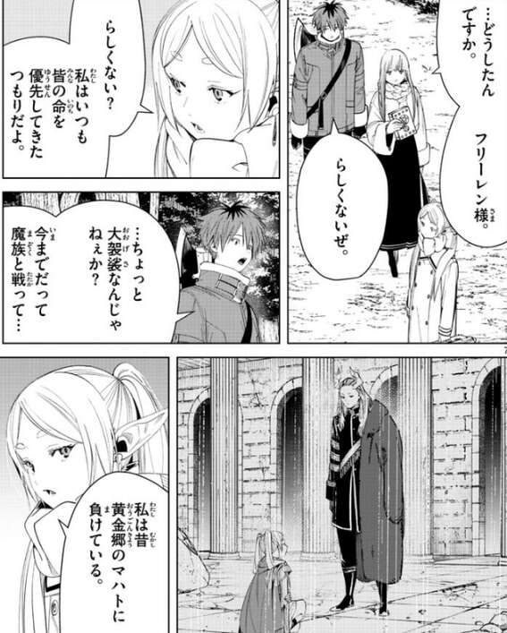 結界の管理者であるデンケンには黄金郷の大結界の通行権があり、デンケンは故郷の村で妻の墓参りを既に済ませた、と言いますが、フリーレンはデンケンが墓参りだけで満足していない様子を察して、今回の依頼を受けないとフェルンに言います。フェルンとシュタルクはフリーレンに、フリーレンらしくないと言いますが、私はいつもみんなの命を優先してきたつもりだよ、とフリーレンは返事をします。
