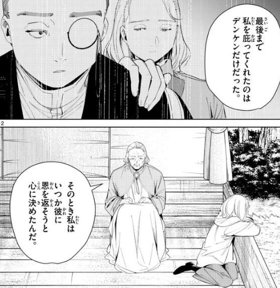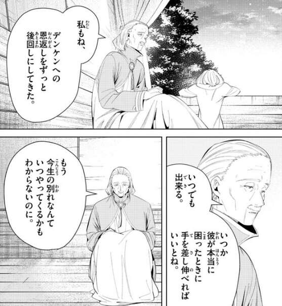 エーデルは随分とデンケンに肩入れするじゃないか、とレルネンに言い理由を尋ねると、デンケンは昔からの友人なんだ、昔の話を始めます。レルネンは若い頃は宮廷勤めの魔法使いで、デンケンとは同期だったと言い、デンケンは帝国軍出身、レルネンは貴族のボンボンと出身は異なっていたが妙に気があって、一緒に働くのが楽しかった、とエーデルに話をします。
