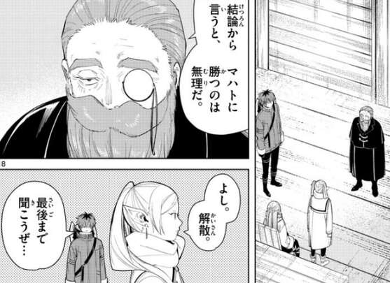 レルネンは、力強く美しい最後の悪あがきをデンケンがきっと見せてくれる、とエーデルに断言します。場面はフリーレン達がいる小屋に戻り、デンケンはマハトに勝つのは無理だ、と結論をフリーレンに伝えます。すると、よし、解散、とフリーレンは即答し、シュタルクに最後まで聞こうぜ…、とツッコまれます。