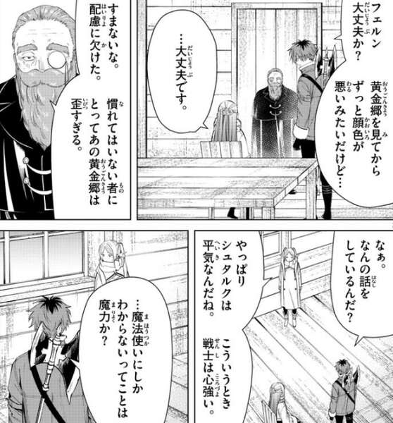 フリーレン一行はデンケンに案内してもらい、結界の管理者の小屋に到着します。小屋に到着する前、黄金郷を見てからずっと顔色が悪いようでシュタルクがフェルンに大丈夫か?と、声を掛けます。魔法使いにとって黄金郷は歪すぎるようでデンケンも配慮が欠けていた、と謝ります。逆にシュタルクは全く平気で、フリーレンがこういう時 戦士は心強い、とシュタルクに言います。