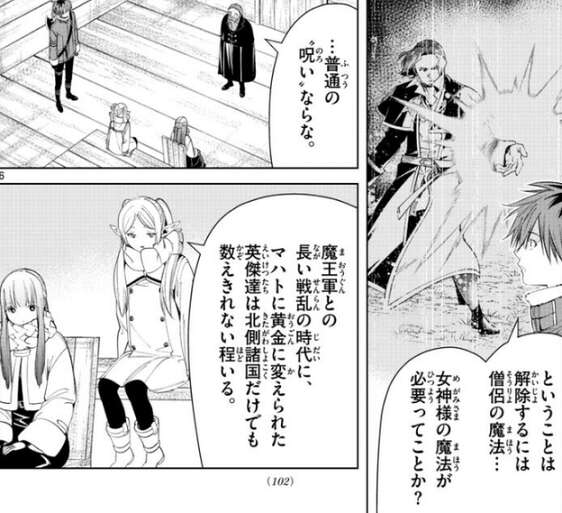 あらゆるものを黄金に変える“呪い”だと聞き、シュタルクは呪いを解除するには僧侶の魔法、女神様の魔法が必要ってことか?と聞きますが、魔王軍との長い戦乱の時代にマハトに黄金に変えられた英傑達は未だに黄金の像のままで、誰一人助かっていない、とフリーレンはシュタルクに答えます。