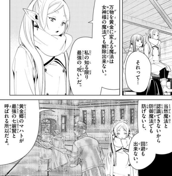 続けてフリーレンは、万物を黄金に変える魔法(デイーアゴルゼ)は女神様の魔法でも解除出来ない、私の知る限り最強の呪いだ、と言います。魔法と認識できなから防御魔法でも防げないし、回避も出来ない、なので黄金郷のマハトには勝算なんてものがあるとは思えない、とフリーレンは言います。