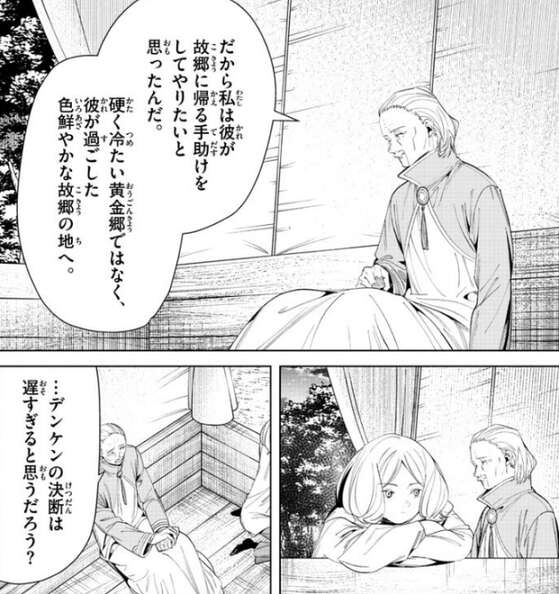 デンケンは、昔は亡くなった妻の思い出話や故郷にいつか帰るんだという話をよくしていましたが、今のデンケンはそんな話をほとんどしなくなってしまったと言い、数年前デンケンの故郷が黄金郷に飲み込まれて、ようやく彼は重い腰を上げた、レルネンは故郷に帰る手助けをしてやりたいと思う、とエーデルに話をします。その話を聞き、デンケンの決断はあまりにも今更だ、とエーデルは言いますが、そう今更だ、でも私は彼を責められない、とデンケンは答えます。