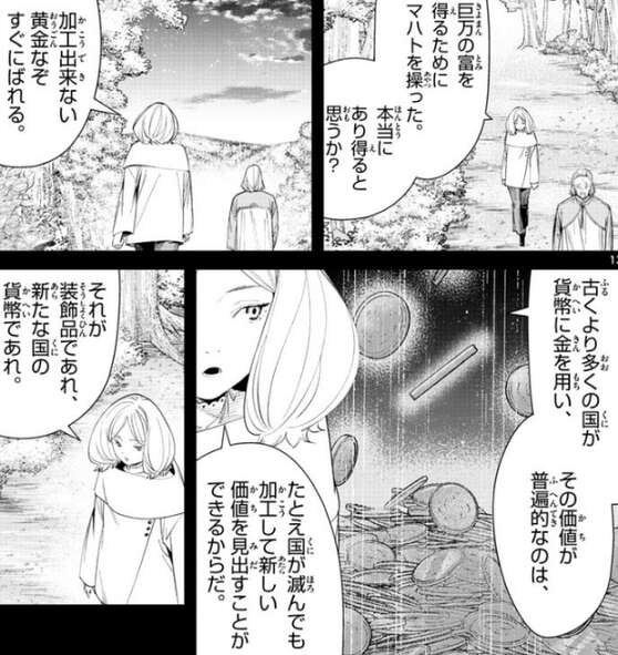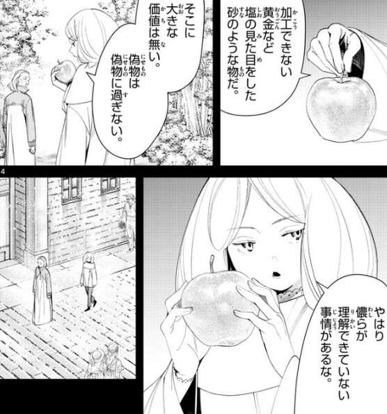 エーデルは領主が巨万の富を得るためにマハトを操ったことに、疑問を持ちます。マハトが魔法で作る黄金は加工出来ないのですぐにばれてしまいます。エーデルは、金の価値が普遍的なのは、多と国が滅んでも加工して新しい価値を見出すことが出来るからだ、と言います。安易に加工が出来て扱いやすい希少金属だから価値があるが、マハトが魔法で作った金は、加工が出来ないので価値はない、とエーデルは断言します。