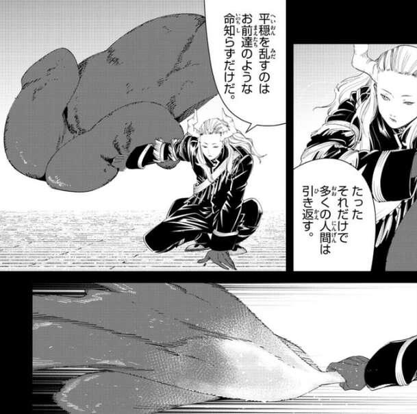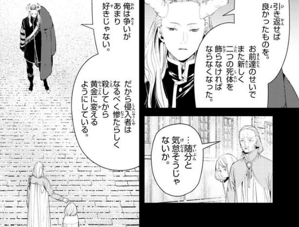 レルネンとエーデルが城塞都市を歩いていると、いつの間にかマハトが後ろに立っていました。マハトは気怠そうに、俺は争いがあまり好きじゃない、だから侵入者はなるべく惨たらしく殺してから、黄金に変えるようにしている、とレルネンとエーデルに言います。