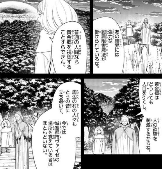 黄金郷の大結界の傍まで来たレルネンとエーデルは、歩きながら黄金郷へと近づいていきます。黄金郷の大結界には認識阻害魔法が掛けられていて、普通の人間では黄金郷を視認することすら出来ません。しかし、それでも黄金阻害魔法を突破して、黄金を持ち帰ろうとする人間はいるようですが、ほとんどの侵入者は生きて帰れません。黄金郷の大結界はあくまで、対魔族に特化しているので人間の侵入を完璧に防げるものものではありません。
