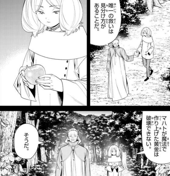 ここの黄金が一般に流通すれば大きな混乱を招きますが、唯一の救いはマハトの作った黄金には見分け方があることです。それは、マハトが魔法で作った黄金は破壊できないことで、どんなに熱しても力を加えても変形することは決してありません。魔法での分析では金として判別されますが、現実には全く別の物質になるそうです。