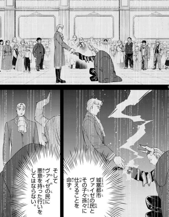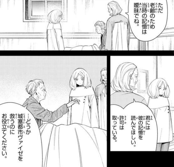 老人は使用人として20年働いていて、記憶を読むにしても情報量が膨大すぎる、なんとか範囲を絞れないか、とエーデルは言います。老人は60年前に領主がマハトに支配の石環を使った場面を目撃している、とレルネンから聞き、エーデルはその時の記憶を読もうとします。老人の記憶を読むと、領主がマハトに支配の石環を着け、城塞都市ヴァイゼの民とその子々孫々に仕えることを命じている場面をエーデルは読み取ります。