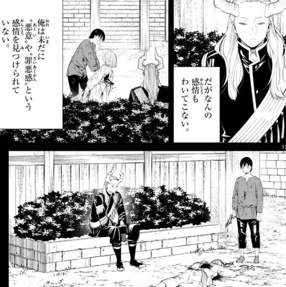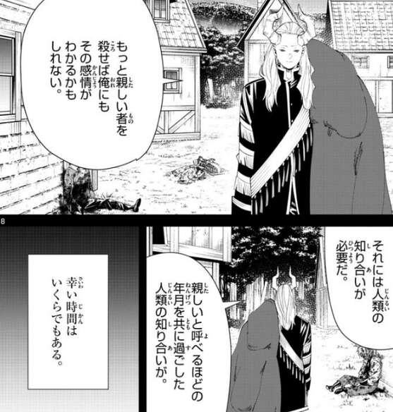 少年が魔族には理解できない感情を抱いているとマハトは知ると、それが“悪意”なのか、それとも“罪悪感”なのかを少年に尋ねます。少年は無言でマハトを睨むと、…そうか、罪悪感か、とマハトは嬉しそうに言います。少年がナイフをマハトに向けて殺そうとしますが、マハトはあっさりと少年を武器で殺してしまいます。そして、名前も知らない少年にありがとう、と礼を言うと、何も知らない奴が何百人死のうが何も感じないのは当然だ、と歩きながらつぶやきます。