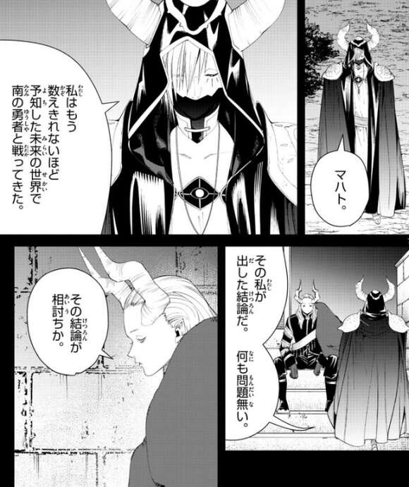 マハトはシュラハトに俺はどう踊ればいいか、尋ねますが、何も考えずにただ戦えばいいと、シュラハトは答えます。マハトという圧倒的な脅威がその場にいるだけで、南の勇者の手数を減らせるようで、問題無いとシュラハトはマハトに言います。さらにシュラハトは数えきれないほど、予知した未来の世界で南の勇者と戦った結論だ、とも言いますが、その結論が相討ちか、とマハトがつぶやきます。
