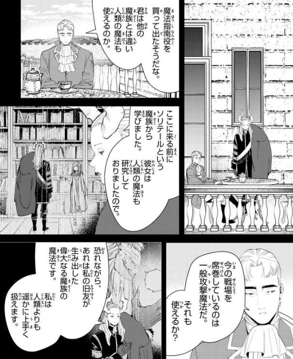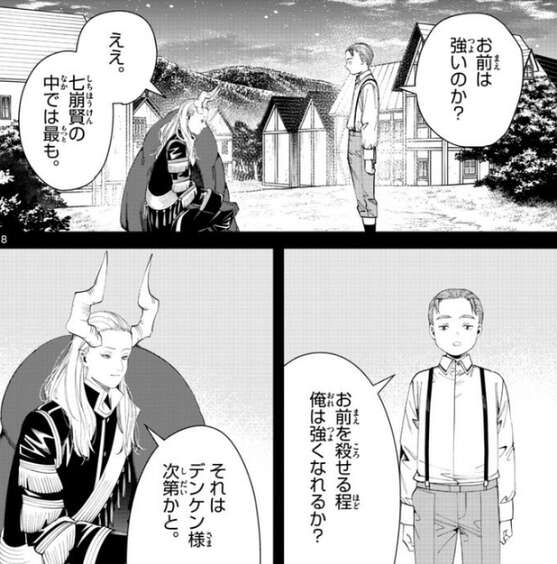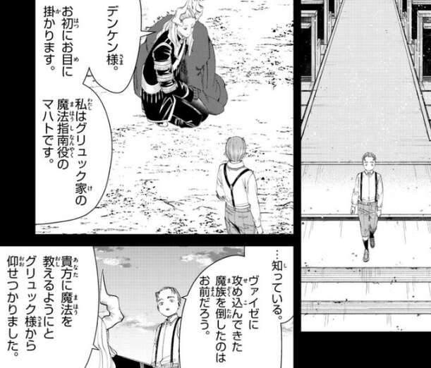 デンケンはマハトに、両親は魔族に殺されたから、俺はお前を信頼していない、と言いますが、それでこそ魔法の教えがいがあります、とマハトは答えます。デンケンはマハトに、お前は強いのか?と、尋ねると、ええ、マハトは七崩賢で最も、とマハトは答えます。お前を殺せる程、俺は強くなれるか?と、デンケンは質問すると、マハトは、それはデンケン様次第かと、と答えます。