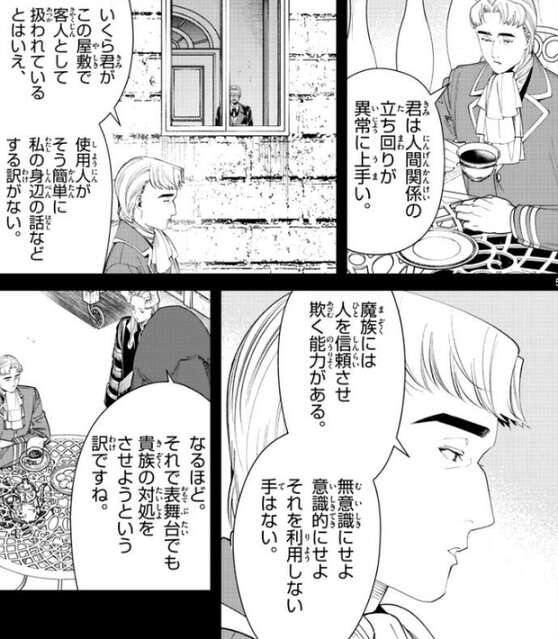 グリュックは表舞台の仕事に話を戻し、マハトにグリュック家お抱えの魔法使いの地位を正式に与えるつもりだ、と言います。魔王が勇者に討たれて、城塞都市ヴァイゼの住民も勝利に湧いているので、これを機に平和の証と称してマハトにグリュック家お抱えの魔法使いの地位を与えれば、表舞台でも動きやすくなる、とグリュックは話します。マハトは人間関係の立ち回りが異常に上手く、屋敷の使用人からも信頼されてしまいした。グリュックは、魔族には人を信頼させ欺く能力があり、それを利用しない手はないと言い、表舞台でもマハトに貴族の対処をさせようと考えます。