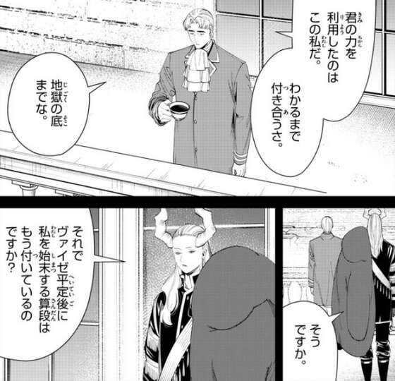 グリュックは、わかるまで付き合うさ、地獄の底までな、とマハトに答えます。すると、それでヴァイゼ平定後に私を始末する算段はもう付いているのですか?と、マハトが質問しますが、どう思うかね?と、グリュックは答えずに誤魔化します。マハトはその質問に対して、楽しみにしています、と答えるのみです。