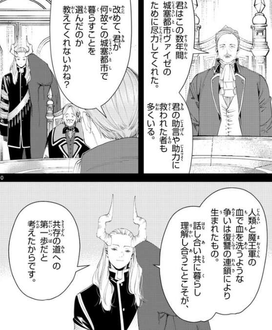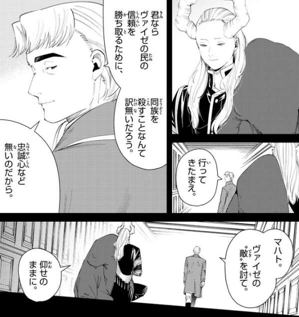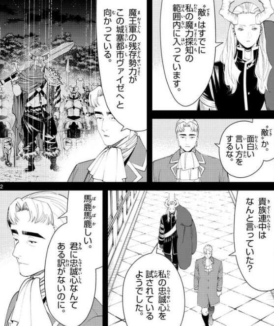 魔王軍の残存勢力がヴァイゼへと向かってきている、とグリュックはマハトに伝えますが、既にマハトの魔力探知の範囲内に入っていて、マハトは“敵”に気付いていました。マハトは貴族達が自分の忠誠心を試しているようだ、とグリュックに言うと、馬鹿馬鹿しい、君に忠誠心なんてある訳がないのに、とグリュックは答えます。