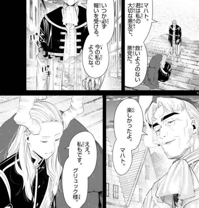 この頃になるとグリュックも年を取ってしまい、立ち上がる時にマハトが手を貸すようになっていました。グリュックはマハトと過ごした時間を振り返り、魔族のマハトにとっては一瞬の出来事に過ぎなかったのだろうな、とマハトに言います。マハトは、たとえ一瞬であったとしても貴方と出会い過ごした時間は、私にとって掛けがえのないものだと考えております、と答えますが、グリュックはそんなマハトに気持ちが悪いな、とつぶやきます。しかし、グリュックはそんなマハトをとてもいい悪友だったとも言いますが、だから、その全てをぶち壊そうと考えました、とマハトは言うと足元の地面を黄金に変え始めます。