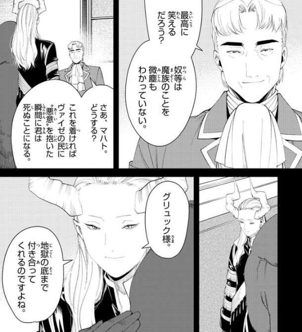 グリュックは、この貴族達の要求を最高に笑えると言い、奴等は魔族の事を微塵もわかっていない、と嘲笑します。そして、さあ、マハト、どうする?これを着ければヴァイゼの民に“悪意”を抱いた瞬間に君は死ぬことになる、とマハトに聞きますが、マハトは自分に“悪意”という感情が無いと分かっているので、地獄の底まで付き合ってくれるのですよね、とグリュックに答え貴族の要求に全て従います。