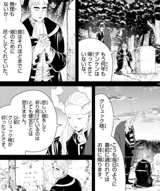 支配の石環をマハトは着けた後、さらに時は流れてレクテューレは病のために亡くなってしまいます。デンケンはショックを受けて、それから何年もヴァイゼに帰っては来なくなります。そして何年か経ち、グリュックはレクテューレの墓参りに毎日通うようになり、こうも毎日のように墓前に通われてはお体に障ります、とマハトはグリュックに注意します。