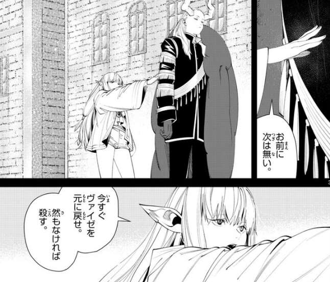 レルネン達は、マハトを殺せば万物を黄金に変える魔法(デイーアゴルゼ)も失伝し、城塞都市ヴァイゼを元に戻す機会を永遠に失ってしまう、と言い、ゼーリエを説得しようとします。しかしゼーリエは、ここでマハトを仕留めなければ被害はヴァイゼ程度では済まない、と言い、マハトはその気になれば北部高原全域を黄金に変えられるだけの力を持っている、流石に看過できん、とゼーリエの部下たちに言います。
