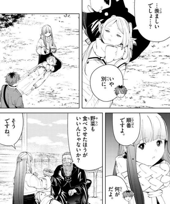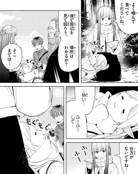 マハトの膨大な記憶を解析しているフリーレンは、全体の処理能力が落ちていてまともに動けず、フェルンにご飯を食べさせてもらっています。しかし熱いからと、食べ物を冷ますことまでフェルンにお願いしていて、ふーふして…、とお願いしているフリーレンの姿を見て、シュタルクは流石に甘やかし過ぎなんじゃねぇか?と、あきれます。