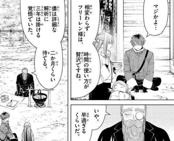 シュタルクはフリーレンに、マハトの記憶の解析にどれくらい時間が掛かるか、質問しますが、…二か月は掛かるかな…、とフリーレンに言われてしまいます。フェルンから時間の使い方が贅沢ですね、と言われてしまいますが、デンケンは解析に三年はかかる覚悟でいた、二か月くらい待てる、と言います。