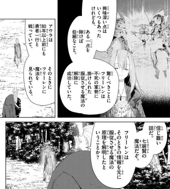 マハトは、終わりだな、次に行こう、とつまらなそうに言うと、どこか遠くの地へと歩きだします。するとソリテールが、七崩賢・断頭台のアウラがフリーレンに討たれた話を始めます。フリーレンが断頭台のアウラとの戦いで、不死の軍勢に掛けられた服従させる魔法(アゼリユーゼ)を解除していたという話をソリテールがすると、マハトは信じ難い話だと驚きます。七崩賢の魔法の原理を解明したということか?と、マハトはソリテールに質問しますが、七崩賢の魔法は人知も人の理も超える、人類には決して扱えない魔法、とソリテールは言い否定します。