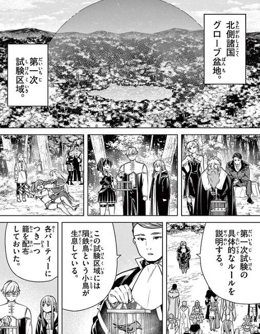 北側諸国、グローブ盆地にて一級魔法使い、第一次試験は行われます。第一次試験の試験内容は隕鉄鳥という小鳥を捕まえて、配布された籠に入れていくこと、そして試験終了の日没までパーティーメンバー全員が生きて揃っている事です。