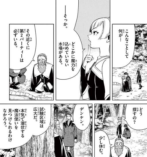 フリーレン達のパーティーは湖を凍らせたり、他の水場に魔力を込めたりと、隕鉄鳥を捕まえるための行動を起こします。一方、デンケン達のパーティーはフリーレン達の行動を見て、フリーレン達が捕獲した隕鉄鳥を奪おうと考えます。
