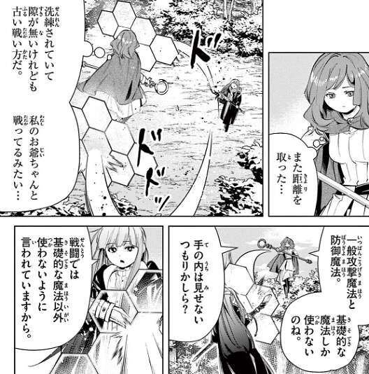 既に隕鉄鳥を捕獲していたフェルン達の第4パーティーは、ヴィアベル達の第8パーティーに襲われます。第8パーティーのエーレは“石を弾丸に変える魔法”(ドラガーテ)を使ってフェルンを攻撃しますがフェルンは全て防御魔法で防ぎ、逆に飽和魔法攻撃でエーレを圧倒します。