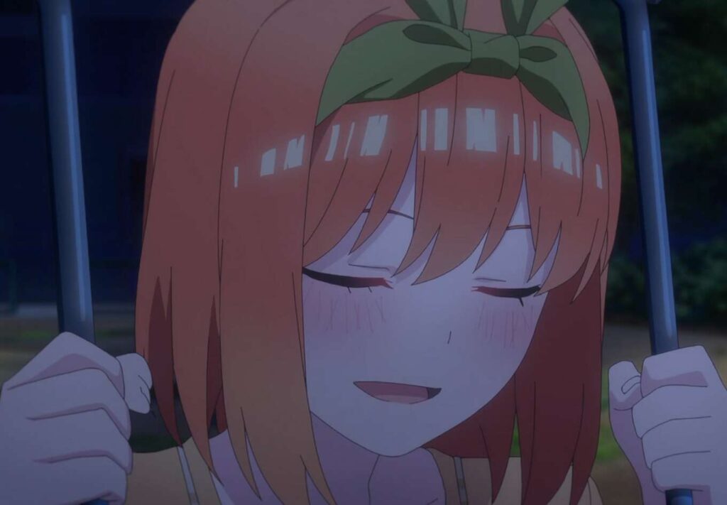 二人でブランコを全力で漕いでいると、きれいな夜景が見えます。全力で漕いだ時に見える景色は、四葉にとってほっこりする景色だと風太郎に言います。