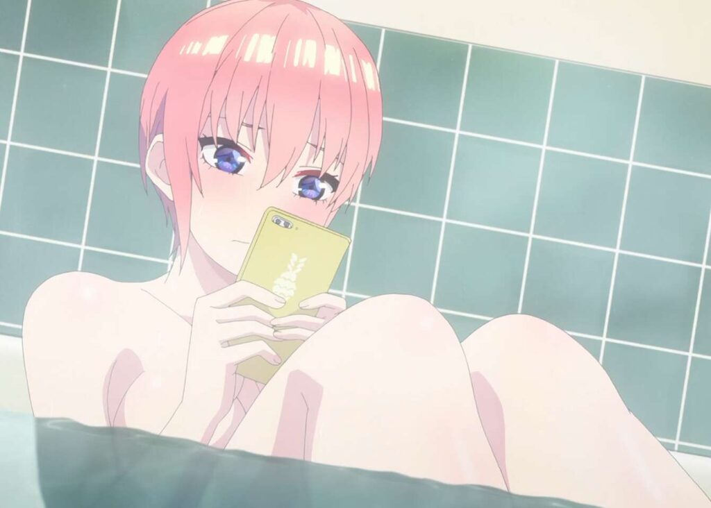 風呂場で一花は他の四人へ、模試勉強の邪魔になるとの理由で、風太郎の誕生日プレゼントを辞めようと、スマホへメッセージを送信します。