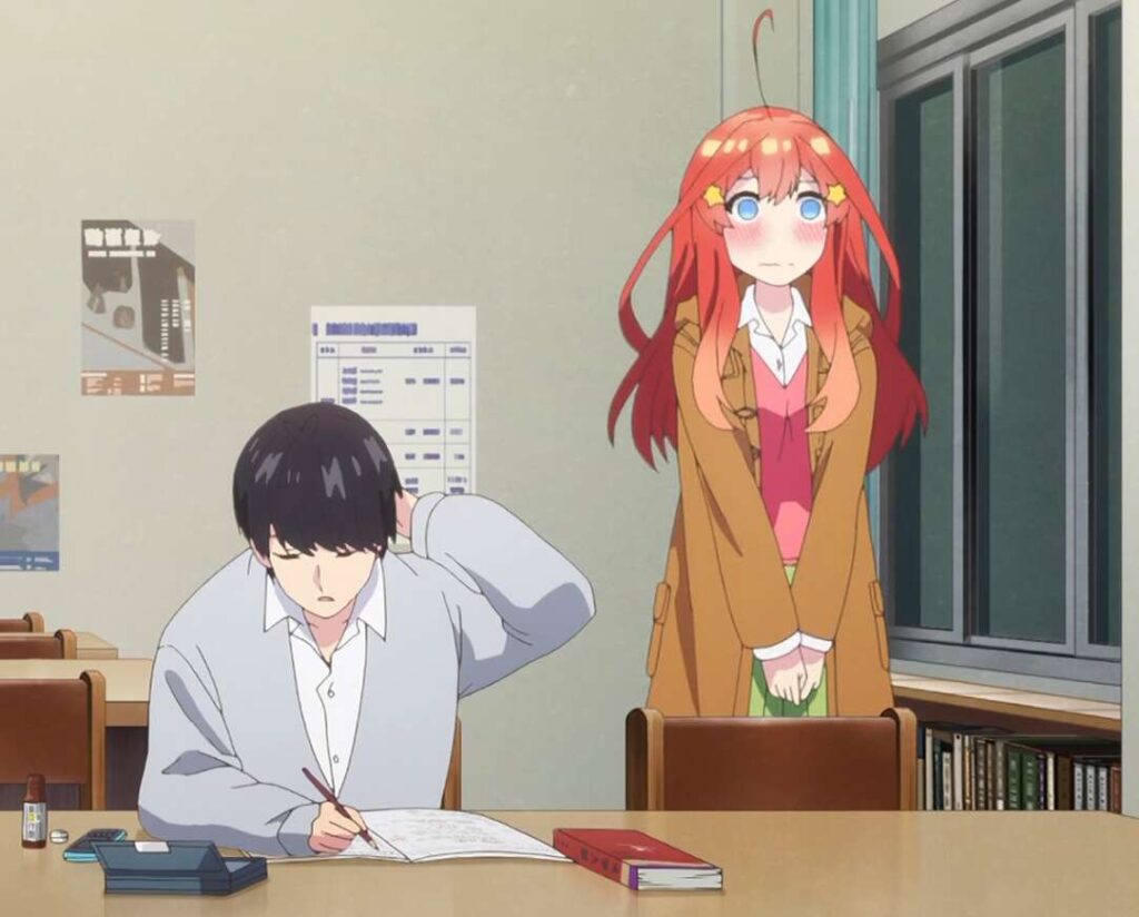 風太郎と一花たちは図書室で勉強を行っていますが、風太郎は疲れから勉強に集中できません。廊下で五つ子たちの勉強と自分のもし勉強を何としても両立させようと考えていると、三玖がやって来ます。風太郎は三玖に、一花が風太郎のことを好きだといった事を改めて聞こうとしますが、一花が邪魔をしに来て風太郎は聞くことが出来ませんでした。