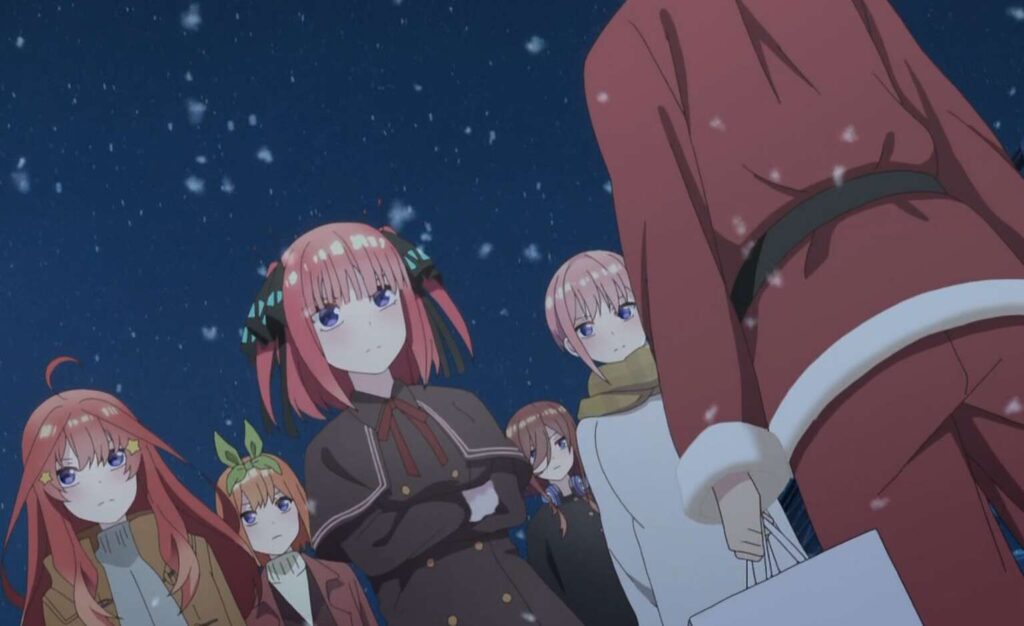 そして月日は流れ終業式も終わり、12月24日のクリスマスイブの日になります。風太郎は雪が降る中ケーキ屋でバイトをしており、イブの日もサンタの格好をしてバイトをしています。そこに五つ子たちが現れ、ケーキの配達を風太郎にお願いします。店長にケーキを無理やり渡され、仕方なく風太郎はケーキを五つ子たちの家まで配達します。