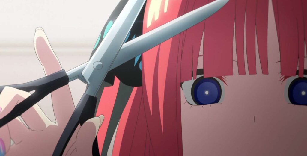 過去は忘れて今を受け入れるべき、いい加減覚悟を決めるべきなのかもね、と二乃は覚悟を決めるとはさみを握って、三玖にもあんたも覚悟しなさいと迫ります。